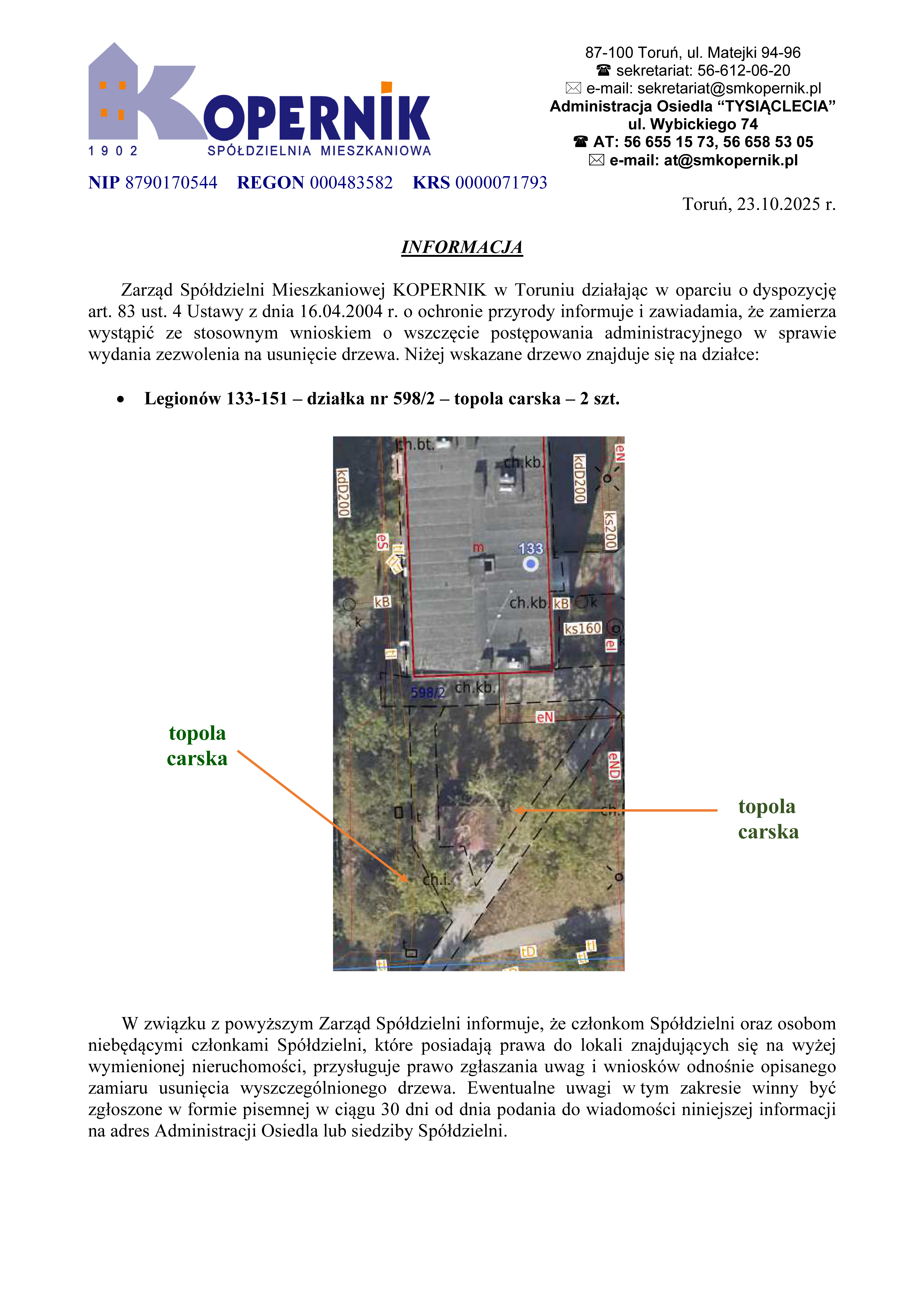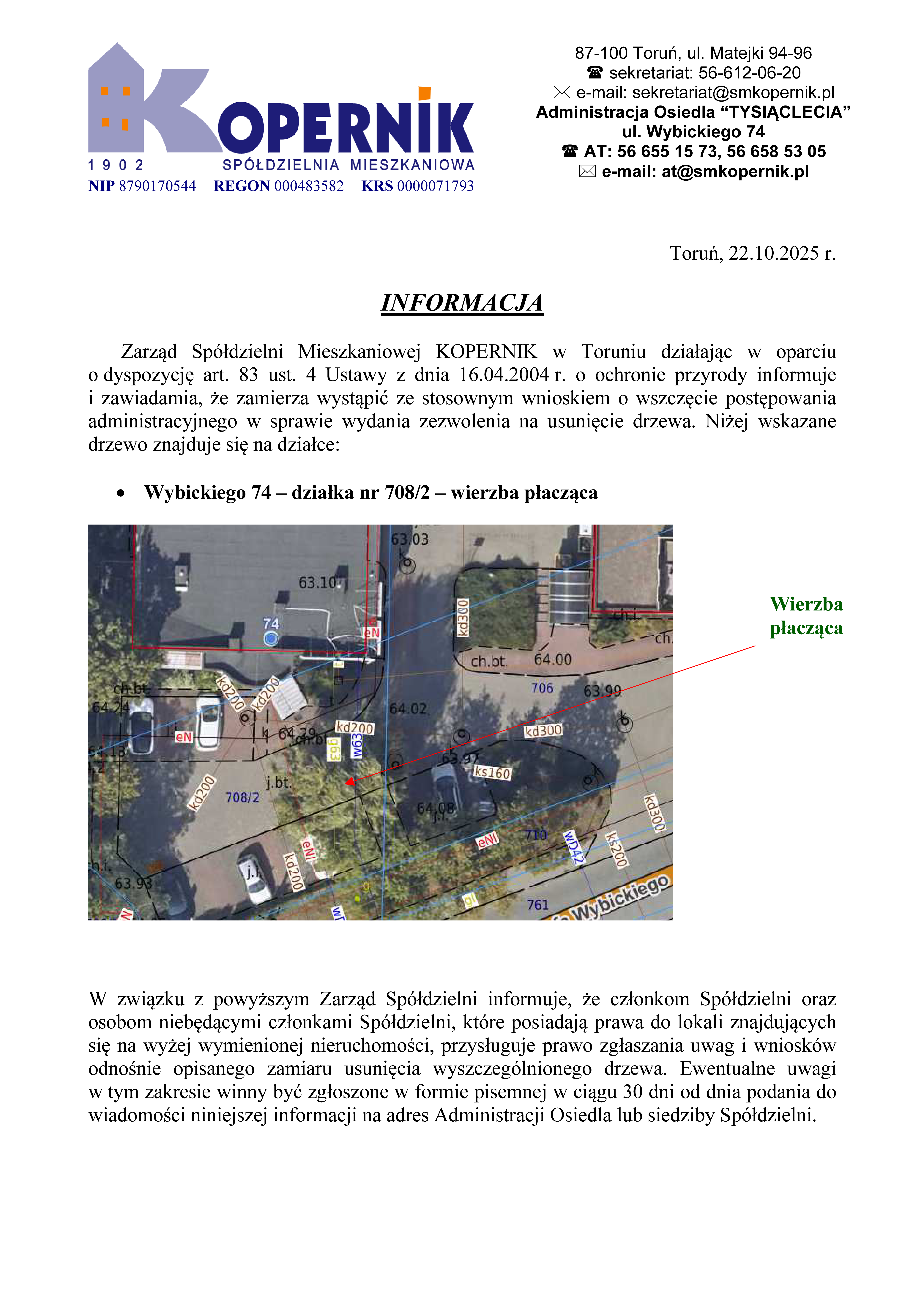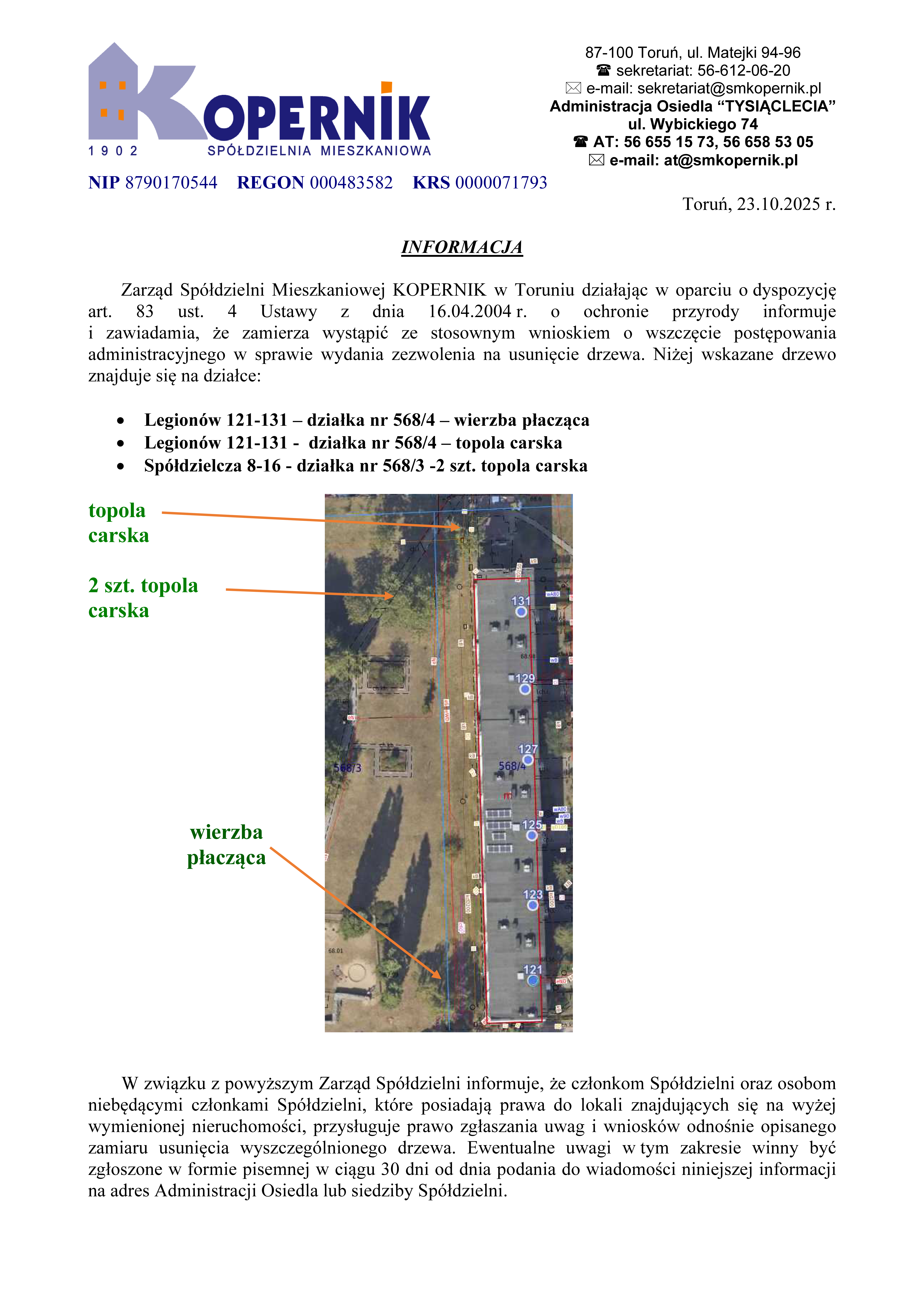 04.11.2025 Wycinka drzew na Osiedlu TYSIĄCLECIALegionów 121-131 Legionów 133-151 Popiela 1-3B Wybickiego 74