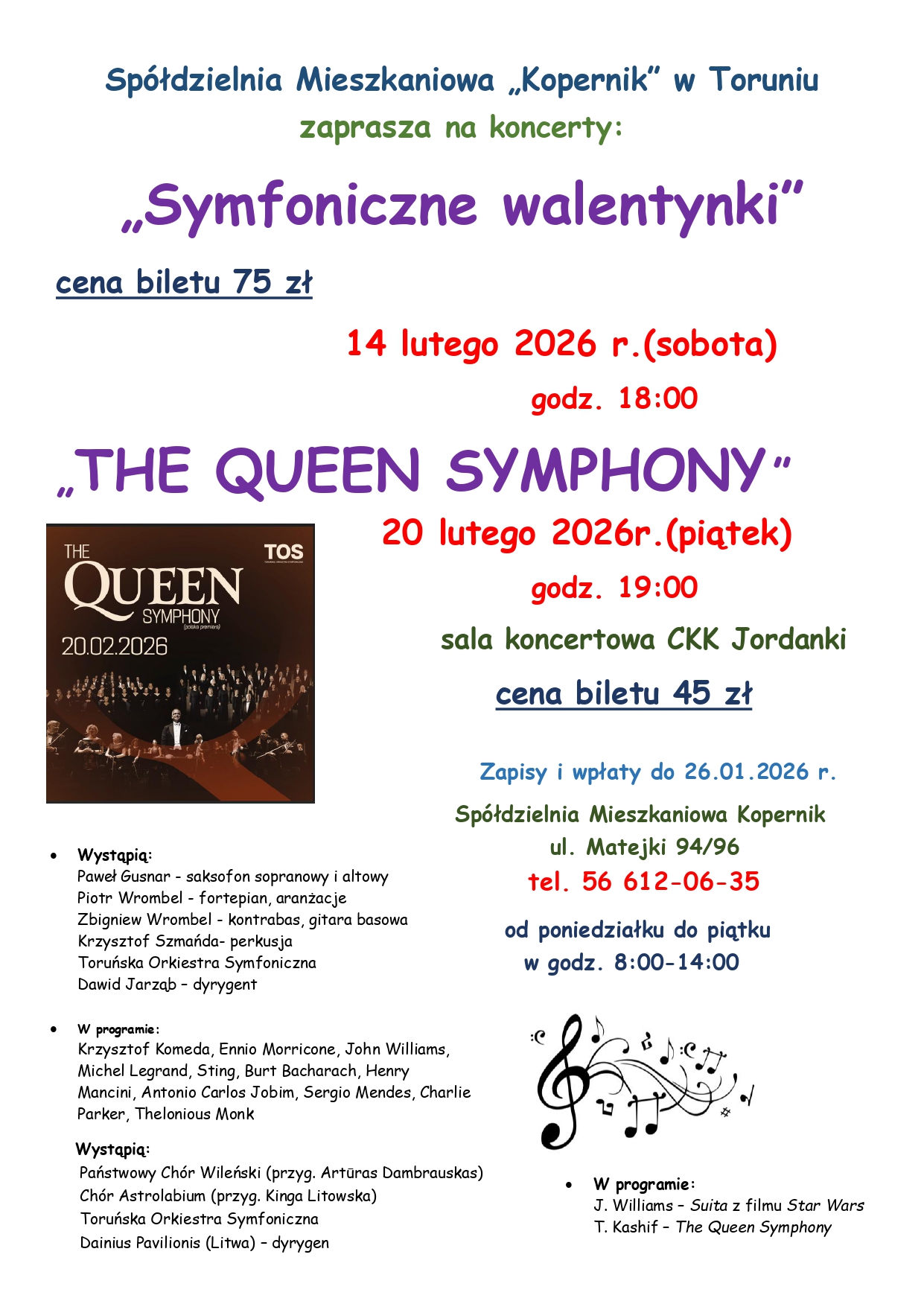 mamy przyjemność zaprosić Państwa na koncert „The Queen Symphony”, który odbędzie się 20.02.2026 r. o godzinie 19:00 w CKK Jordanki. Cena biletu wynosi 45 zł.