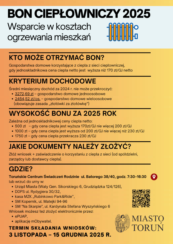 Wszystkie informacje w tej sprawie znajdują się na stronie internetowej Toruńskiego Centrum Świadczeń Rodzinie: https://tcsr.torun.pl/bon-cieplowniczy-2025-rok/