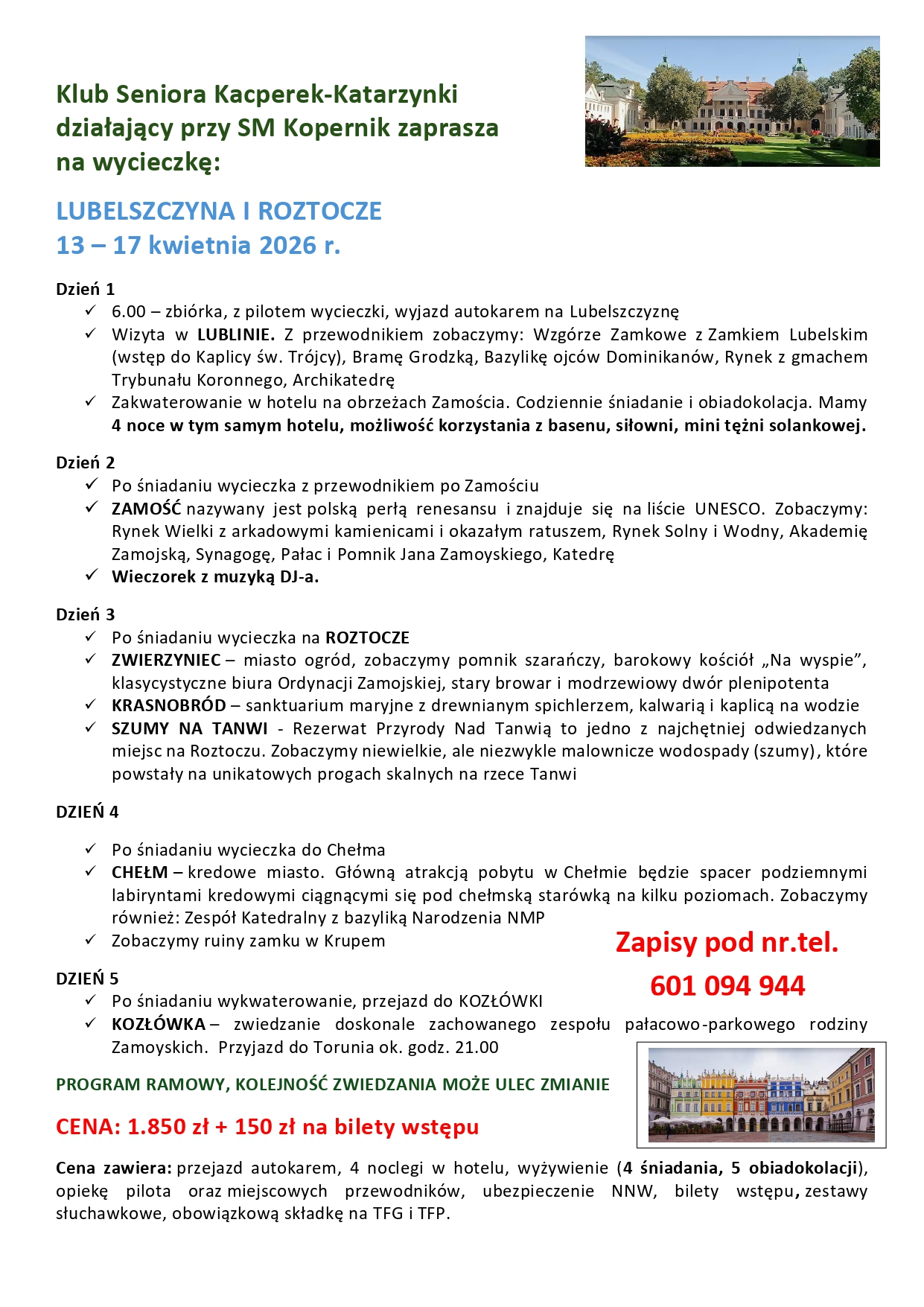 13-17.04.2026 - Wycieczka "Lubelszczyzna i Roztocze"